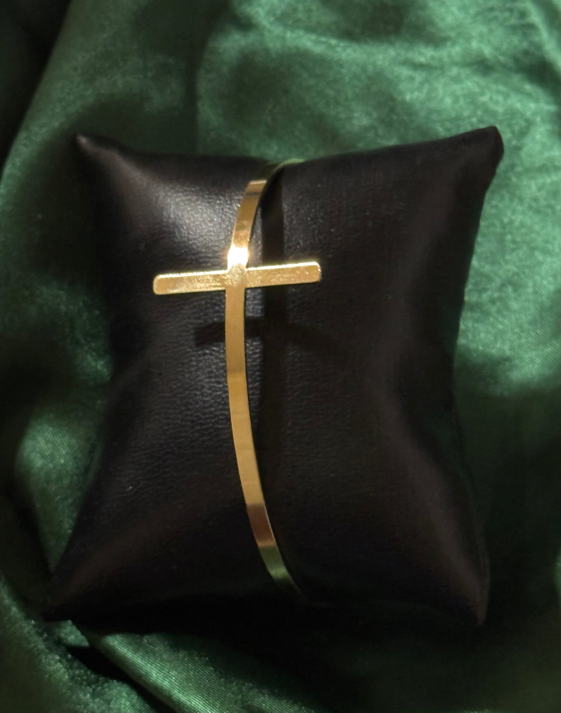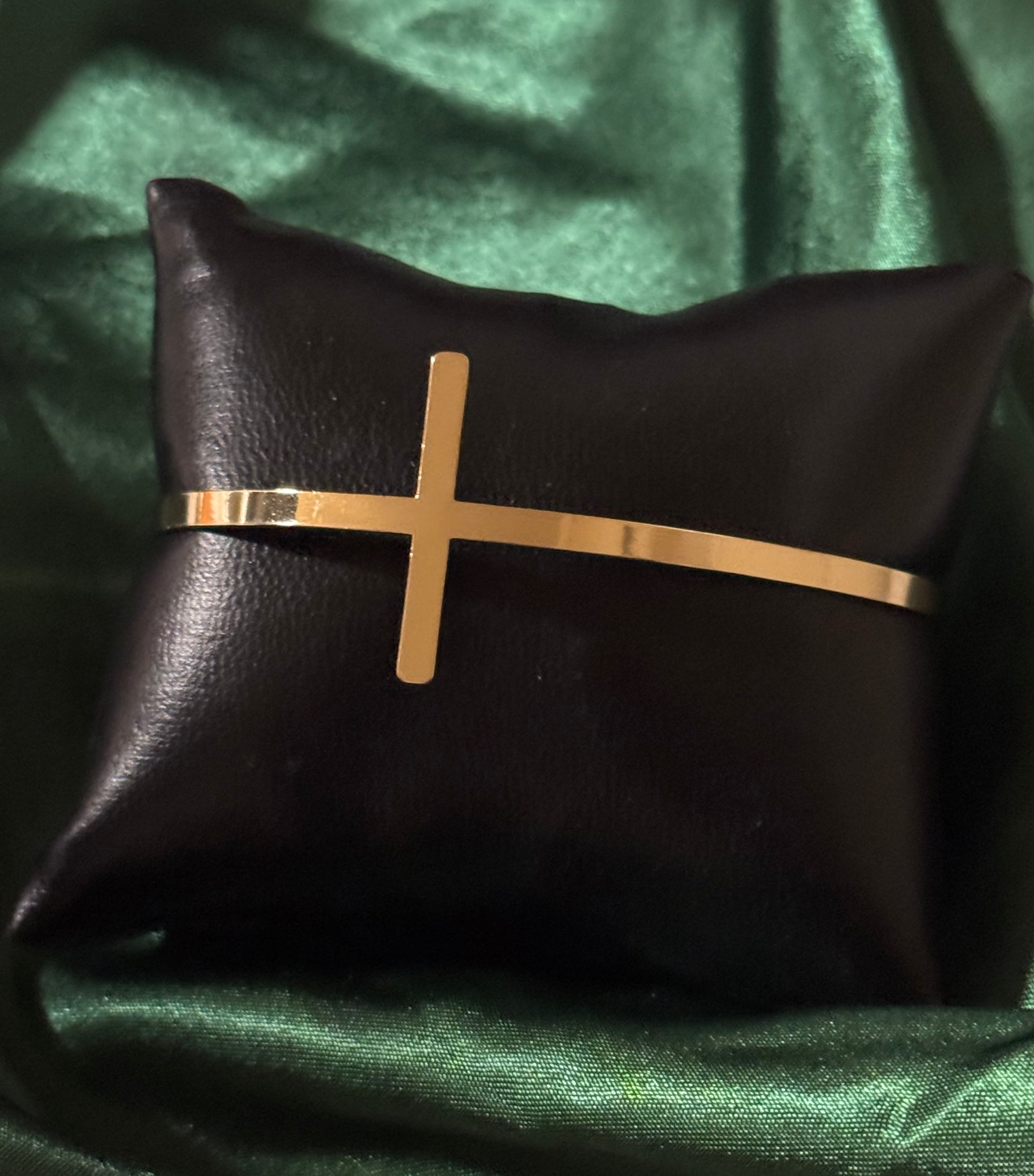 Beautiful but simple gold tone Cross cuff bracelet to accommodate most wrists with its open back
