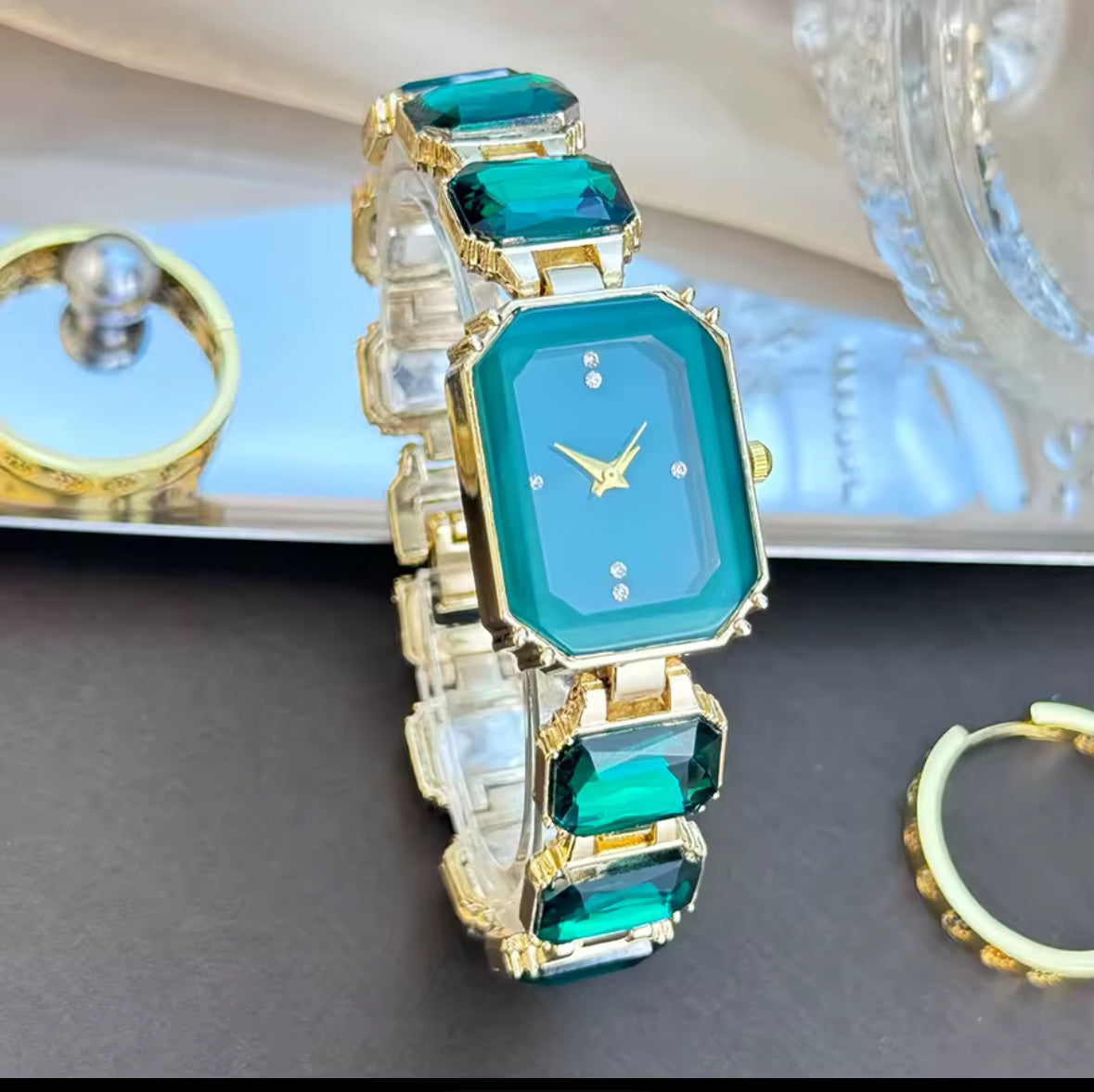 Luxury Rhinestone Original Quartz Watch- Fashion Bracelet Clock Gold-Green
