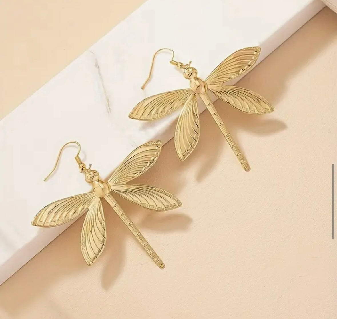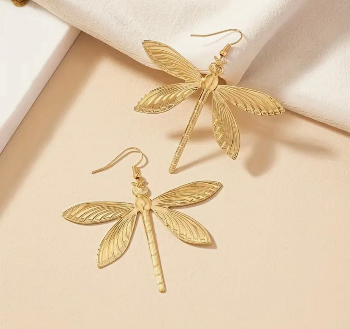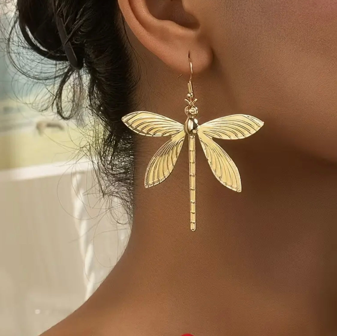 1 Pair Elegant Dragonfly Dangle Earrings - Golden-Tone Metal Intricate Wing Design