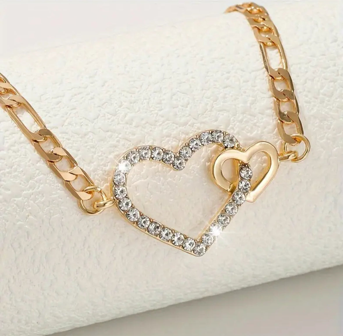 Gold-Plated Double Heart-Shaped Necklace for Women, Featuring Simple Heart Designs Adorned with Rhinestones.